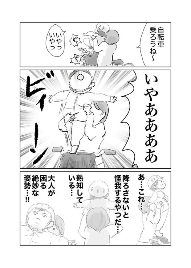 さにぃがぁるさんがお子さんを自転車に乗せようとしたところ、嫌がってしまい足をビィーンとそろえてしまいました。子ども用シートには跨る必要があるため、このままでは危険。さにぃがぁるさんは一度降ろすことに。知ってか知らずか、大人が困る言動をするときってありますよね…。