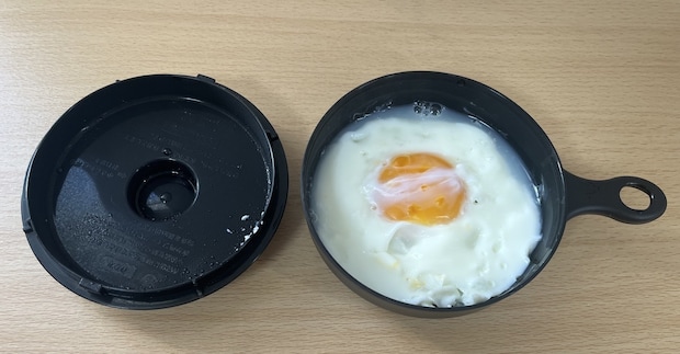 調理法は簡単で、容器に卵を割り入れ、爆発防止のために黄身に数箇所穴を開けて白身を切り、蓋で計った水を加えて500Wで約60秒加熱するだけです。