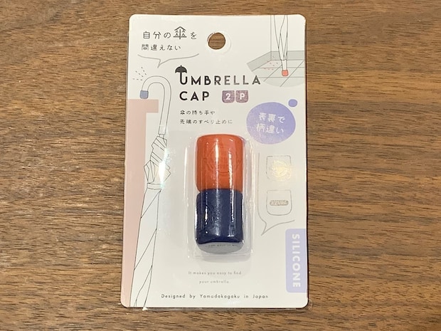 傘に取り付けるキャップが2個入った「アンブレラキャップ」です。自分の傘の取り間違えを防止したり、傘を固定する際に利用します。