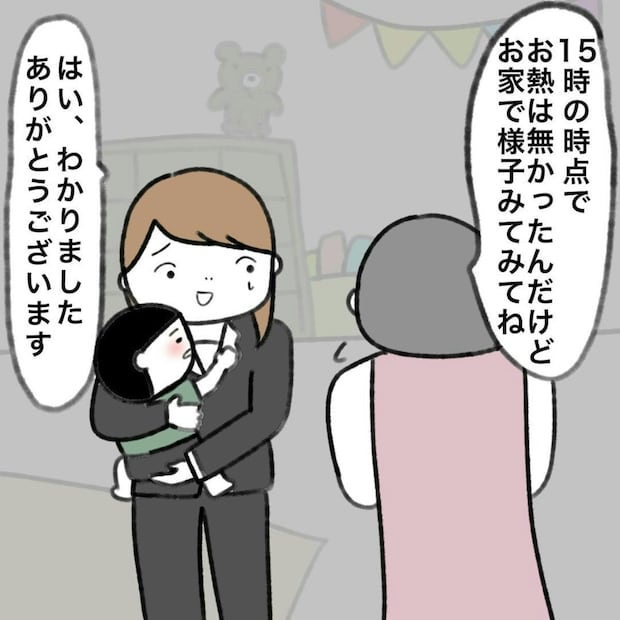 お迎えの際に先生に呼び止められたかかじりさん。先生から体調不良の前兆のような報告、これはかかじりさんにとって不穏を意味しますね。