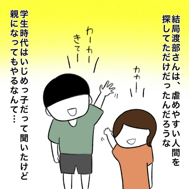 かかじりさんが出会った渡部さんもその一人。最初は気さくに話してくれたものの、次第に不快な言動が増え、嫌がらせを受けることに。思い切って気持ちを伝えたところ、周りのお母さんたちが助けてくれました。なんと彼女たちは、学生時代に渡部さんからいじめられた経験があったのです。大人になり、親になっても「いじめる」という行為をやめられない人がいること驚いたかかじりさん。その後渡部さんは転園し、どうしているかわかりませんが、また新しいターゲットを見つけているかもしれません。