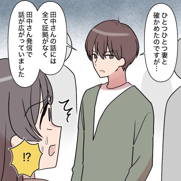 田中さんは健太の話をニヤニヤしながら聞いていましたが、健太が「ひとつひとつ妻と確かめたのですが・・田中さんの話には全て根拠がなく、田中さん発信で話が広がっていました」と淡々と説明すると、驚いたような表情で健太の顔を見ました。