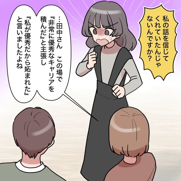 「私の話を信じてくれていたんじゃないんですか?」と健太に食って掛かる田中さんに、私は冷静に「・・田中さん、この場で『非常に優秀なキャリアを積んだ』と主張し、『私が優秀だから妬まれた』と言いましたよね」と先ほどの田中さんの言葉を繰り返し、