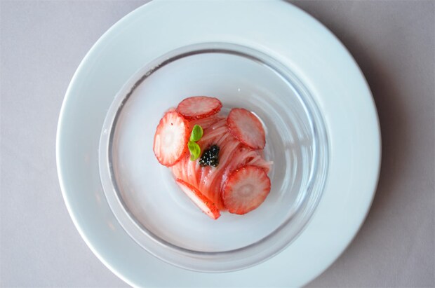 そこにオリーブオイルのコクと薄切りのいちご、最後に忘れるなかれのキャビア様の塩味が合わさればもう…味のマリアージュに感服です。