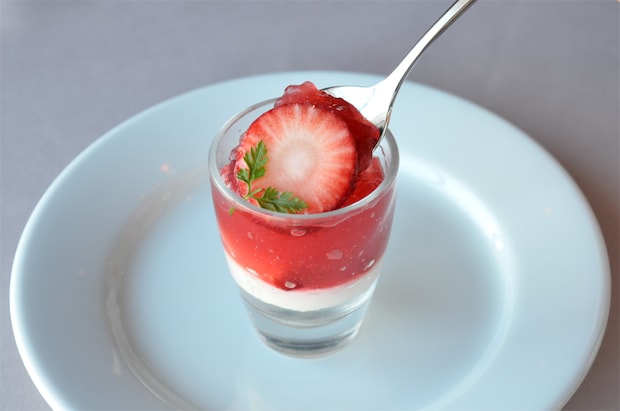 いちごジュレとレモンジュース、にんにくが入っているそうで、いちごをミキサーにかけたフレッシュジュースのようなお味です。でもスイーツのように甘い!というわけではなく、サッパリとした味わい。