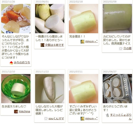 つくれぽ(作りましたフォトレポートのこと)にも「カピカピした大根が戻りました」「みずみずしくおいしくなって嬉しい」「放置するだけでいいなんて驚きです」など、喜びのコメントがたくさん届いています。