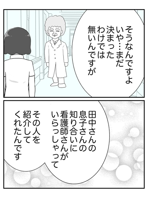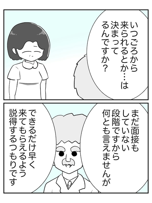 大変と思われた新しい看護師探しは、田中さんの息子のおかげですぐに候補の看護師が見つかり、早速面接に進む予定です。施設長はベテラン職員のアイさんにそのことを伝えると、その言葉を聞きながらアイさんの心の中には不安が芽生えていました。