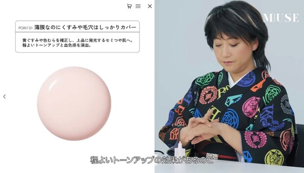 まずは下地。肌に貼り付くようなぴたっとした質感が薄膜なのにナチュラルな光沢を生み出し、大人でも挑戦しやすい程よいセミつや肌を叶えてれるアイテム。ニュアンスローズの色味がトーンアップ効果も。