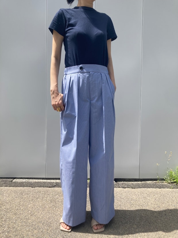 展示会で予約購入したこちら。その時は何の気なく、涼しそうだしあったら便利かなくらいの軽い気持ちで選んだのですが、コレ本当に皆さん買って後悔させません。まずね、めっちゃくちゃ軽い。コットンとポリエステルの混紡で、薄くてシャキっとした素材のシャツ地が使用されていて、はいていて気持ちがいいんです。肌にまとわりつかず、接触冷感の効果か常にサラッとした肌触りで、湿度が高い今の時期もかなり快適に過ごせています。もちろん真夏もガンガン着倒す予定です。猛暑だからって、調子に乗ってショートパンツをはいたりした日は絶対にお腹を下すようなヤワな私は1年を通して、フルレングスのパンツがお約束。自宅の洗濯機で洗える上に、パンパンとシワを伸ばして干せば、ノーアイロンで写真の状態で着用できちゃうのも嬉しいポイントです。正面から見るとキレイなパンツにですが、後ろウエストにはちゃんとゴムがイン。なので、しゃがんだり座ったりもノーストレスでデスクワークの多い日、お子さんとお出かけの多い日にもオススメですよ。