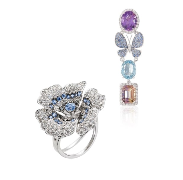 リング[K18W&×DIA×ブルーサファイア×ブラックダイヤモンド]¥1,826,000、ピアス※片耳[K18WG×DIA×アメシスト×アクアマリン×アメトリン×ブルーサファイア]¥1,460,800(共にミオ ハルタカ/ミオハルタカ トーキョー)