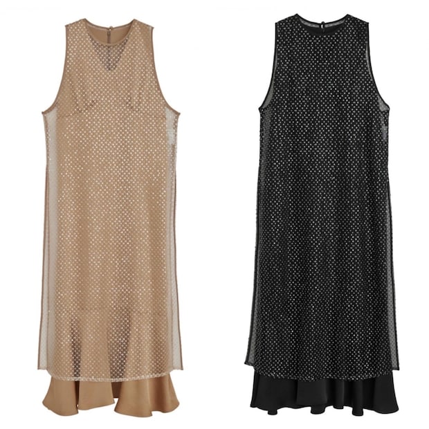 「深めのサイドスリットが入ったスパンコールのシアードレスはデニムなどを重ねて着るのもオススメ」渋沢さんの着ているベージュとブラックの2色展開。ドレス各¥25,300(共にアメリ/アメリ ヴィンテージ)