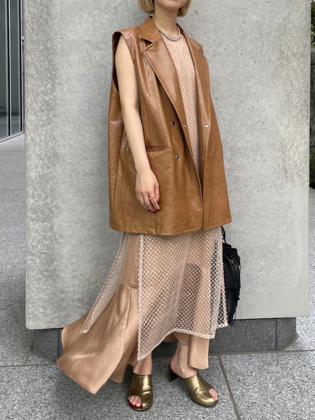 「ブラウンベージュのワントーンコーデがポイント。キレイめなレイヤードドレスに、あえて少しハードな印象のレザーベストを合わせて異テイストMIXに。正装とまではいかないけれど、きちんと感を出したいシチュエーションをイメージしたドレススタイルです」