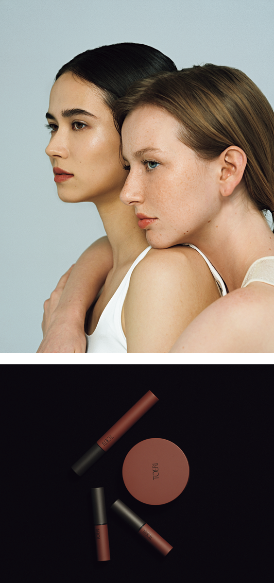 コンセプトは「時間を味方につけるコスメ」。ラインナップは最小限の手間で確かな効果を得られる3品のみ。上から:スタイリングマスカラ¥2,750、クッションファンデーション¥4,620、リップスティック 全2色 各¥2,530(全てモデラート)