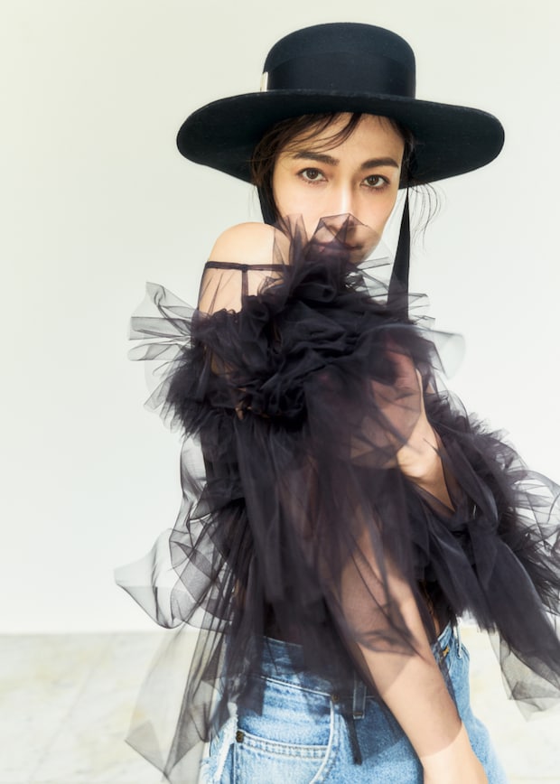 シアーブラウス¥63,800(マージ/エストネーション グランフロント大阪店)、中に着た水着※ブラトップを着用¥20,900(プロタゴニスタ/アマン)、デニムパンツ¥64,900(プロトタイプス/ザ・ウォール ショールーム)、ハット¥97,900(ロジェ ヴィヴィエ/ロジェ・ヴィヴィエ・ジャパン)