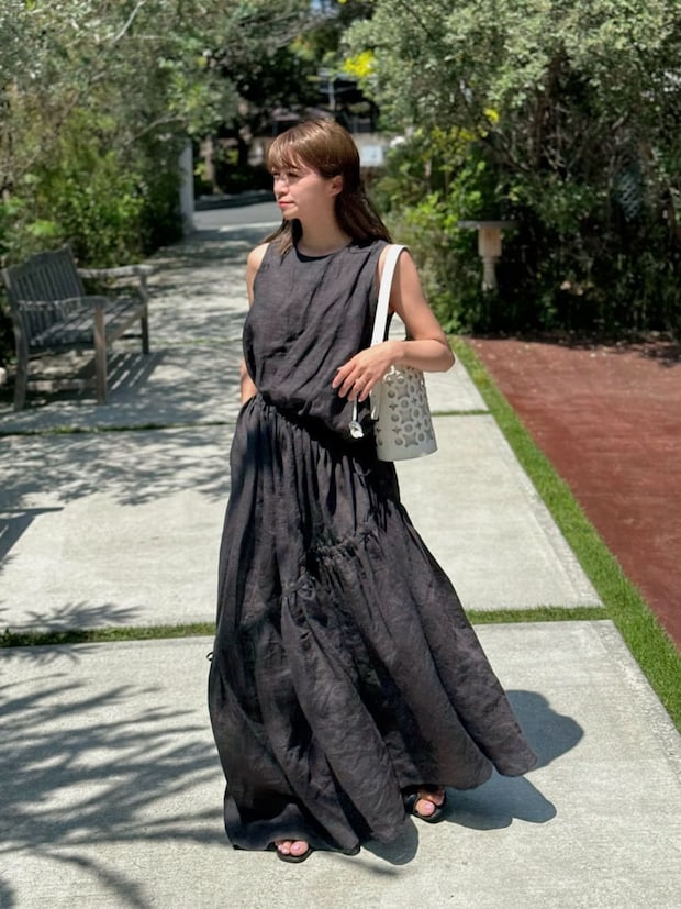 「ボリュームたっぷりのブラックドレスにホワイトのバッグをワンポイントにきかせたモノトーンコーデ。ドレスのカラーは墨黒に近いブラックのヘンプ素材なので、モノトーンでも重くならず夏らしく着られるのがポイント。1枚で華やかなに決まるのでこれから大活躍しそうです」