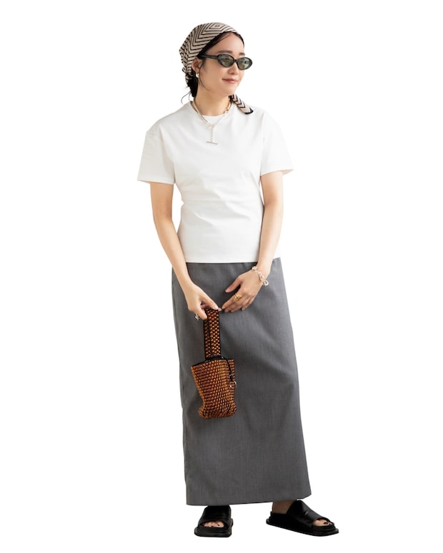 「ウエストシェイプがきいたTシャツのシルエットを生かし、キレイめなペンシルスカートを合わせて女性らしいカジュアルスタイルに仕上げました」
