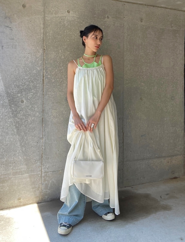 軽やかなギャザードレスにキレイ色でほんのりスパイスを。「ワイドデニムとスニーカーを合わせてドレスをカジュアルに落とし込みました。ライトグリーンのキャミソールを重ねて、さり気なくアクセントも」