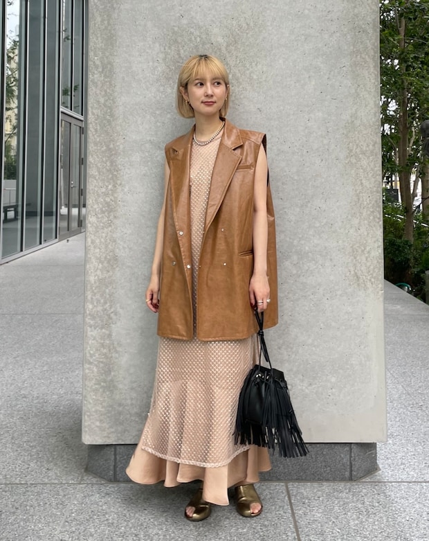 キレイめなレイヤードドレスをレザーベストで程よくエッジーに。「ブラウンベージュのワントーンコーデでまとめてみました。スパンコールのシアードレスはデニムなどを重ねて着るのもオススメです」