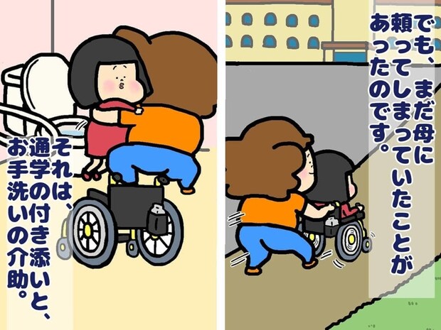大学では、ドアを開けるにも誰かの手を借りなければならず、困ったときは自分から助けを求めて行動していました。それでも、通学の付き添いとお手洗いの介助だけは、母の助けが必要でした。