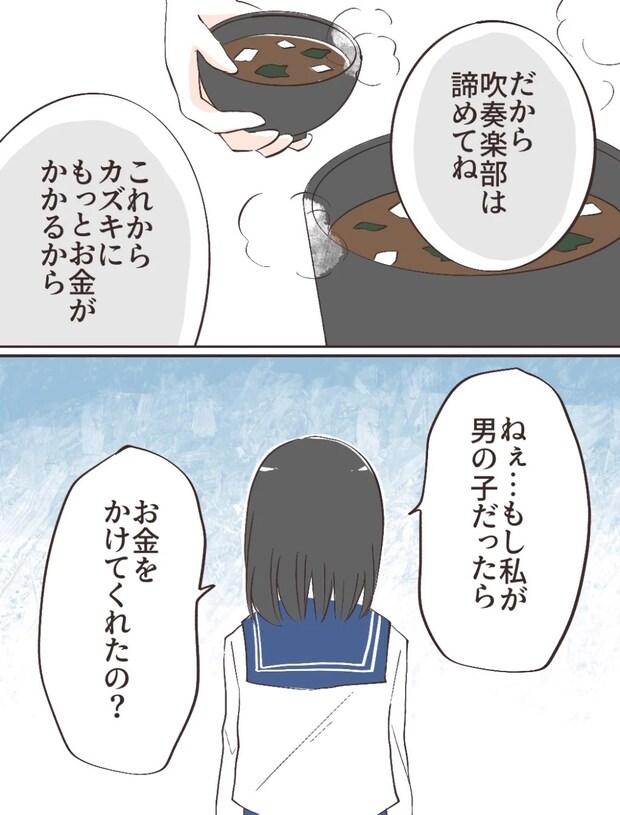 「だから吹奏楽部は諦めてね、これからカズキにもっとお金がかかるから」母のその言葉に、頭を殴られたような衝撃を受けました。カズキは男の子だから、何でも許されるの?女の子の私は、ただカズキの希望を叶えるために生きているの?胸に溜まった思いを堪えきれず、私は母に「ねぇ、もし私が男の子だったら、お金をかけてくれたの?」と問いかけました。