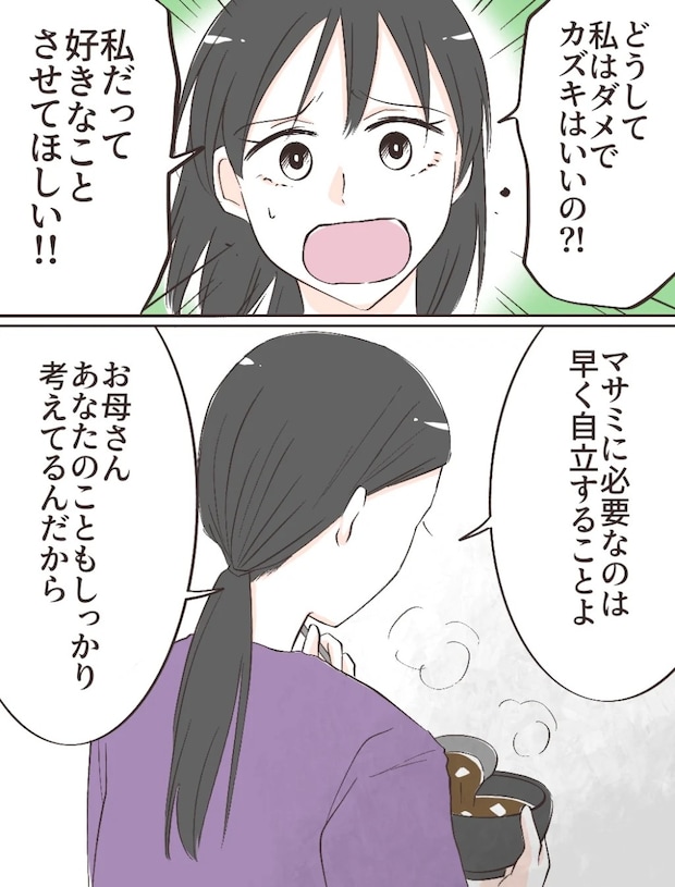 「どうして私はダメでカズキはいいの!?私だって好きなことさせてほしい」必死に訴えましたが、母には届きません。それどころか、「マサミに必要なのは早く自立することよ、お母さん、あなたのこともしっかり考えてるんだから」と、言葉巧みに言いくるめられてしまいました。