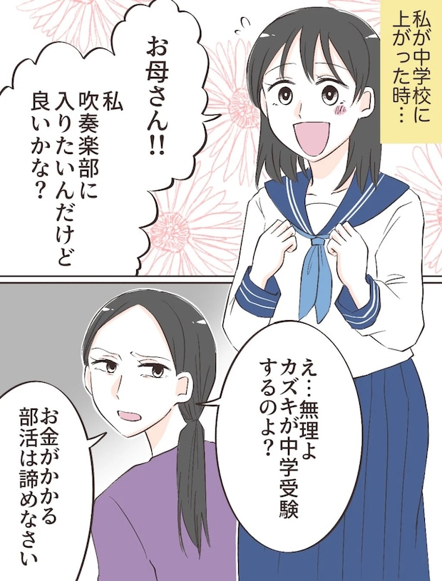 私が中学校に上がった時もそうでした。「お母さん!私、吹奏楽部に入りたいんだけどいいかな?」興奮気味に話す私に、母は「無理よ、カズキが中学受験するのよ?お金がかかる部活は諦めなさい」と冷たく言い放ちます。この時もカズキが優先されたせいで、私の希望はあっさり切り捨てられてしまいました。