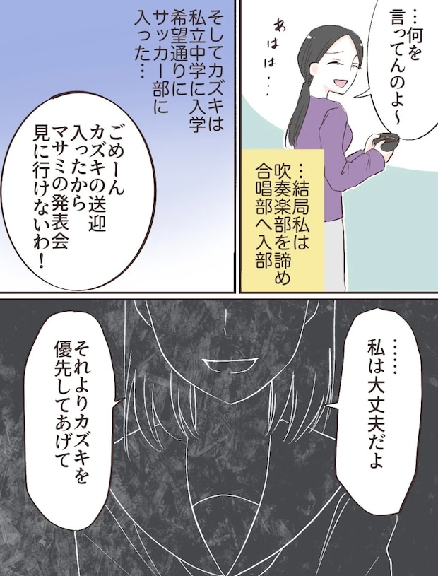 すると母は「何を言ってんのよ~」と冗談っぽく笑うだけ。結局、私は吹奏楽部を諦め、お金のかからない合唱部へ入部。そしてカズキは私立中学に入学し、希望通りサッカー部に入りました。学校生活が始まってからも、母はカズキが優先。私の発表会があっても、後からカズキの送迎が入れば迷わずそっちを選びます。いつからか「大丈夫だよ、カズキを優先してあげて」という言葉が、私の口癖になっていました。