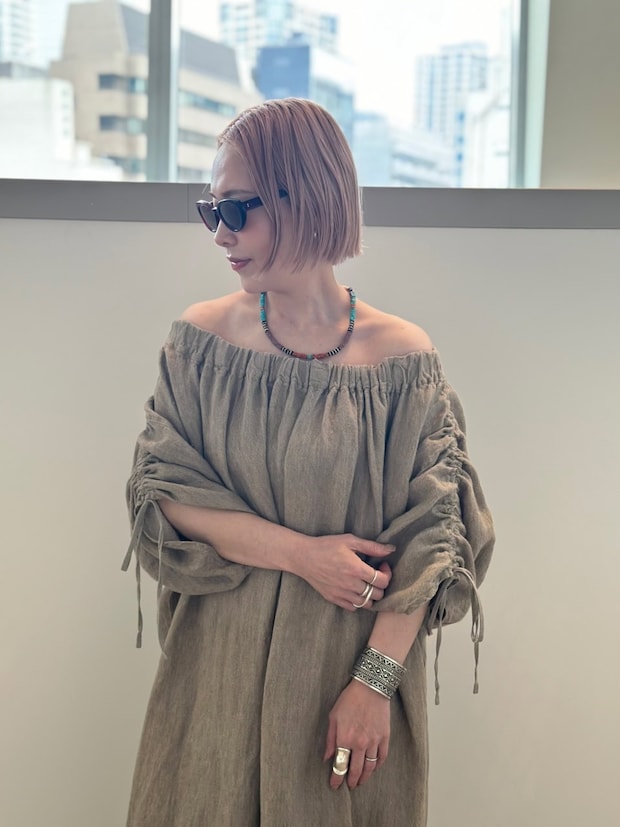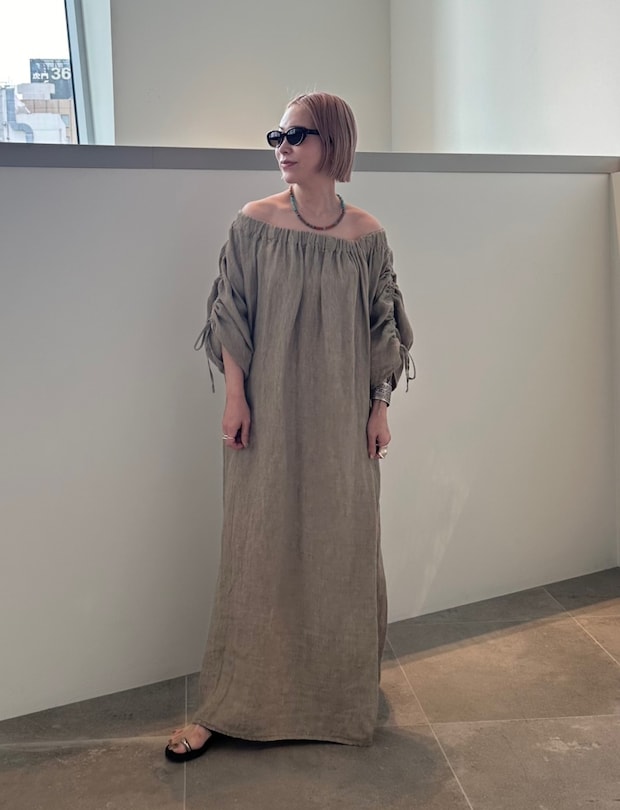 「オフショルダーが印象的な夏らしいリネンドレスを主役にしました。シルバーのインディアンジュエリーやビーズネックレスなど、小物もドレスのムードに合わせてナチュラルな雰囲気のものをセレクト。サングラスでリゾートムードとほんのりスパイスをプラス」