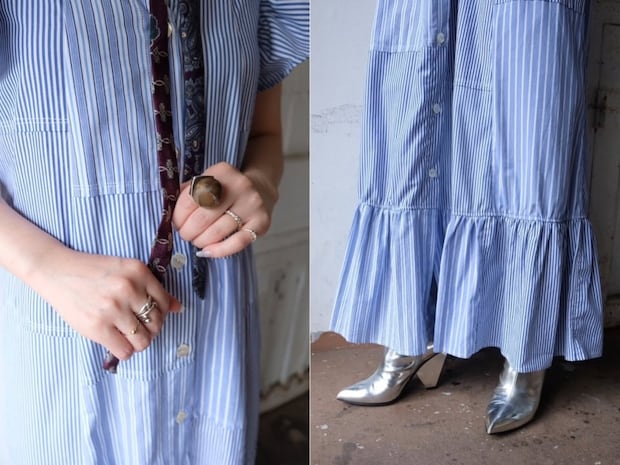 「ロングドレスを主役に、タイやシルバーのシューズなどの小物使いで甘さをおさえました。ドレスは古着のメンズストライプシャツ約5着を解体してパッチワークしたもの。袖や裾には贅沢にフリルが施されていて、これからの季節に1枚で着用したくなるような華やかで存在感のあるデザインが気に入っています」