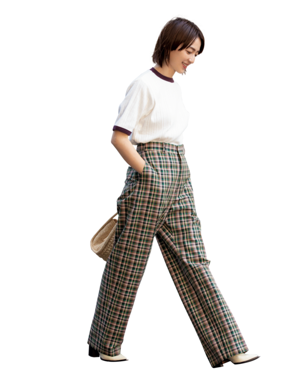 「無地でシンプルなリンガーTには、チェックパンツを合わせてキャッチーになるようにしました。Tシャツとパンツのブラウンをリンクさせているのもポイント」