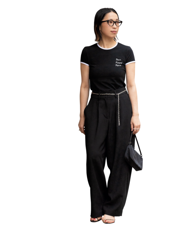 Tシャツ¥16,500(ピース)、 パンツ¥123,200(ラ コレクション)、別注ベルト¥19,800(イオ)、左手リング¥35,200、右手リング¥28,600 (共にアサミ フジカワ)、ヴィンテージバッグ¥94,600(プラダ)、サンダル¥34,320(トニービアンコ/全てガリャルダガランテ 青山店)、その他は本人私物