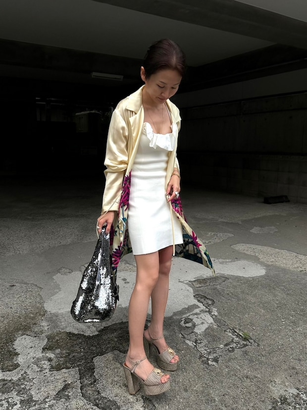 「真っ白なミニドレスに大振りの花柄のガウンを羽織り、メタリックなバッグとサンダルをアクセントに合わせました。ジャックムスのドレスは、色違いで黒も持っているほどお気に入りの1着。胸元のフリルを取り外すとシンプルなデザインにもなるので重宝しています」