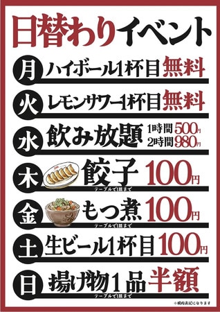 炭火串焼全品半額デーや、毎日曜日別激安イベント開催