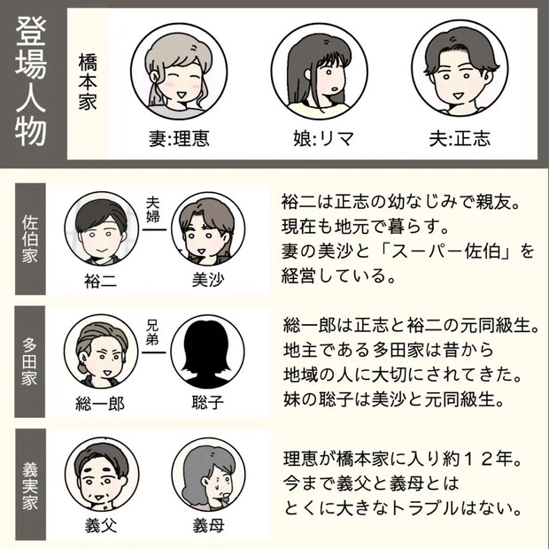 真面目で優しい夫正志さんと娘リマちゃんと幸せに暮らしていた理恵さんの日常は、正志さんの同窓会参加をきっかけに崩れていきました。同窓会で地元に帰った正志さんは、地主の息子である総一郎さんの妹聡子さんが離婚して地元に戻ってきたことを知り、みんなで聡子さんをサポートすると言って毎週末地元に帰るようになりました。次第に正志さんが家族よりも聡子さんを優先するようになり、2人の関係を疑い始める理恵さん。浮気はきっぱり否定した正志さんでしたが、聡子さんを支えたいと言って突然離婚を切り出しました。夫婦で話し合うこともせず勝手に離婚を決め、仕事も辞めた正志さんにもう何を言っても無駄だと感じた理恵さんは離婚に同意。後日、お互いの親も交えて離婚条件を話し合い、リマちゃんの親権と家、そして正志さんの退職金と預貯金は養育費として理恵さんが受け取ることになりました。離婚成立から数ヶ月後、正志さんの幼なじみ夫婦で仲良くしている美沙さんから「話したいことがあるから聡子さんと一緒に行ってもいい?」と電話をもらった理恵さん。困惑しながらも家に迎え入れると、同窓会の日は正志さんとは会釈程度でほとんど話さなかったこと、そして学生時代には彼からストーカーまがいのことを受けていたと聡子さんから聞き、理恵さんと美沙さんは驚きます。
