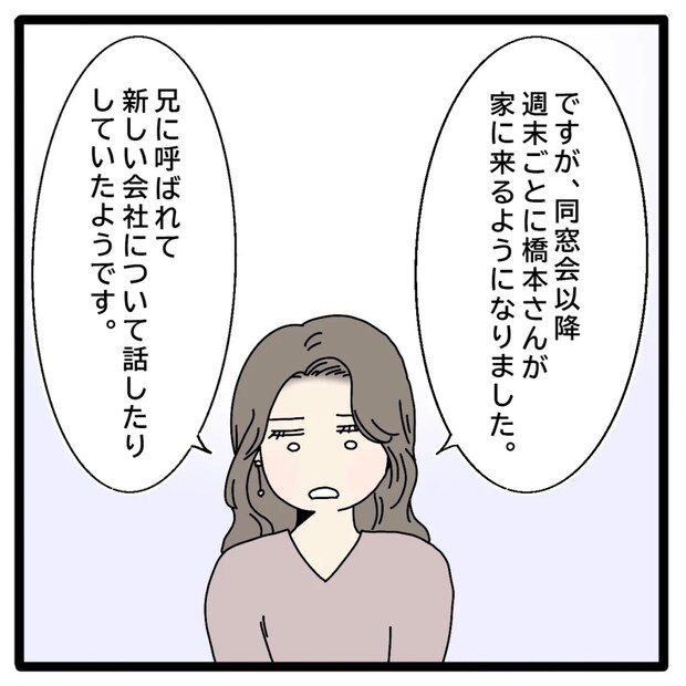 「同窓会以降、週末ごとに橋本さんが家に来るようになりました、兄に呼ばれて新しい会社について話したりしていたようです」たしか正志は離婚の話し合いのとき、総一郎さんと地元を盛り上げるために起業すると言っていました。その打ち合わせのために、頻繁に多田家へ通っていたのでしょう。