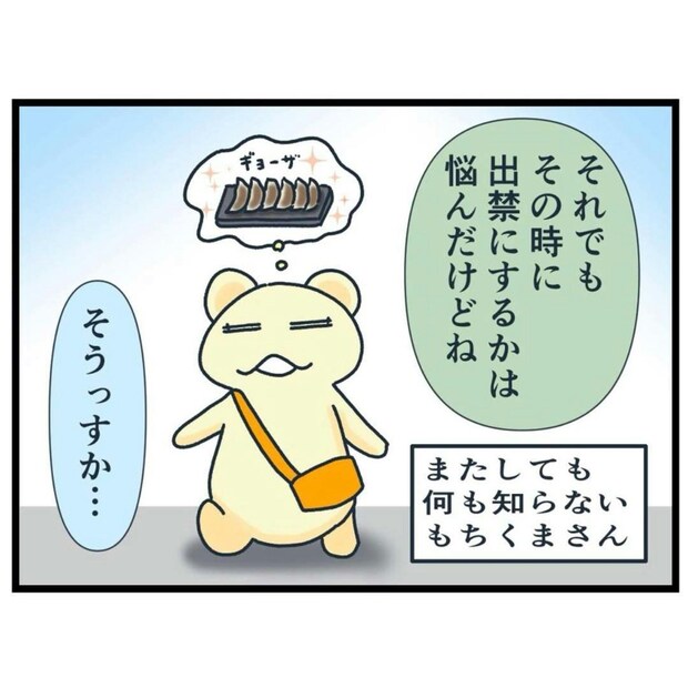 ある日、ナエくまさんがよく行くお店で、煙草の煙を吸いたくないにもかかわらず喫煙席に座るという自分本位の振る舞いからお客さまとトラブルを起こしてしまいます。見かねた店主によって問句さんは出禁を言い渡されることになりました。飲食店は、多くの人が一緒に過ごす場所です。仕事や勉強の緊張から解放され、気分良く食事ができるペースであるのが理想的ではないでしょうか。自分本位な振る舞いは、結果的に自分の信用や居場所を失うことにつながると気づかされるエピソードです。