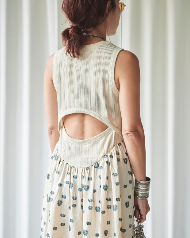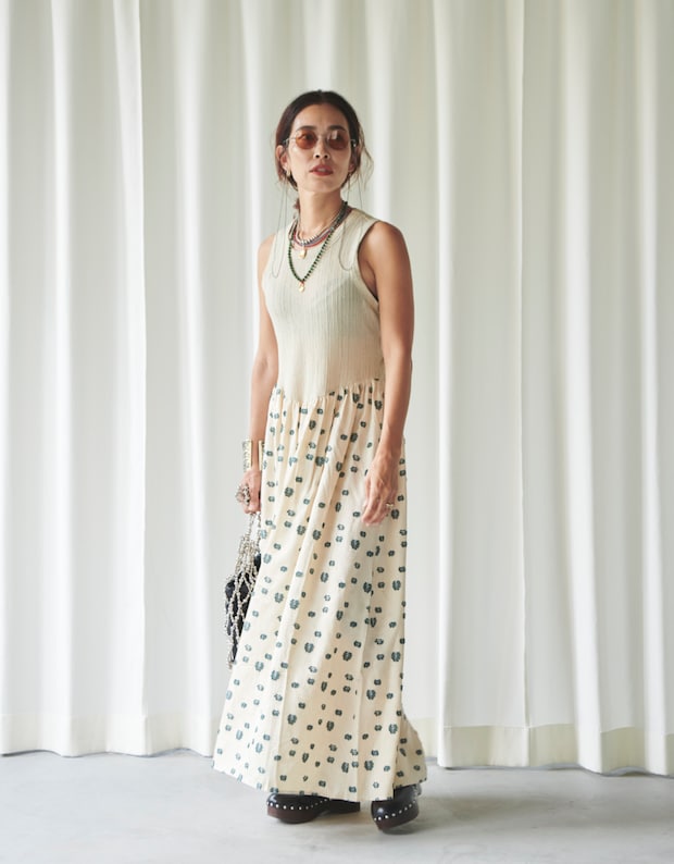 「サラッと一枚で映えながらも、日常に溶け込むドレスを選びました。トップスとスカートを組み合わせたようなユニークなドッキングドレスは、サングラスやカラーのきいたアクセサリーを重ね付けし、夏の暑い日差しに映えるスタイリングを意識しました」
