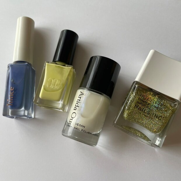 左からhince L003 DAY OUT、エレガンス ラズルエナメルラッカー26、ARTIDA OUD ヴィーガンネイルポリッシュ 09 philia、ネイルズインク エイチディー グリッター オールウェイズ エレクトリック