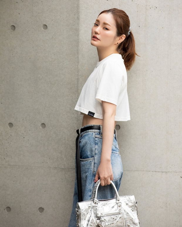 courrèges のTシャツ、Maison Margielaのデニムパンツ、BALENCIAGAのバッグ、Chaosのベルト、GIGIのピアスは本人私物