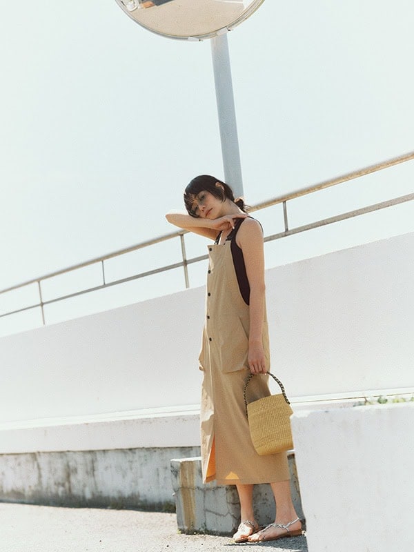 ジャンパードレス¥47,300、キャミソール¥9,900、バッグ¥25,300(カバナバシュ)、サンダル¥110,000(カンフォラ/全てロンハーマン)、サングラス¥29,700(ザベッドフォードホテル/キングスター) ☑撥水