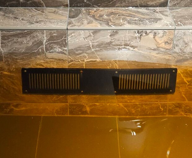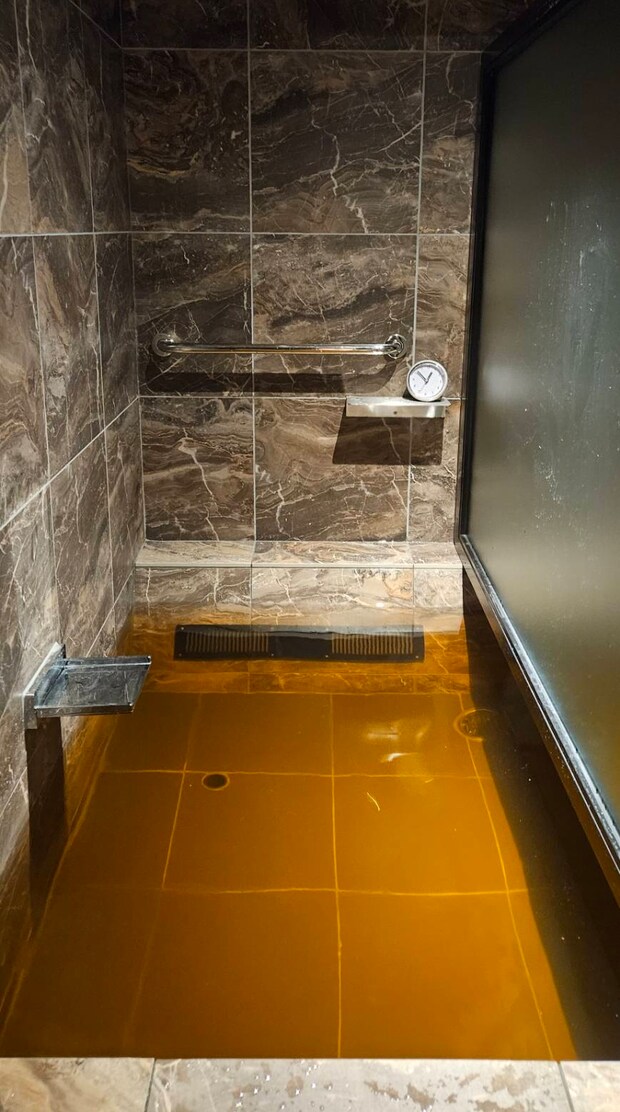 女性用の個別エリアはこんな感じ。明るくして写真撮らせてもらいましたが実際はもっと暗いです。縦長のお風呂で、壁面に横長の排水溝のようなものがありますが、あそこから電気が出るんですって。