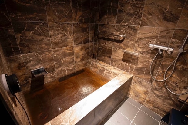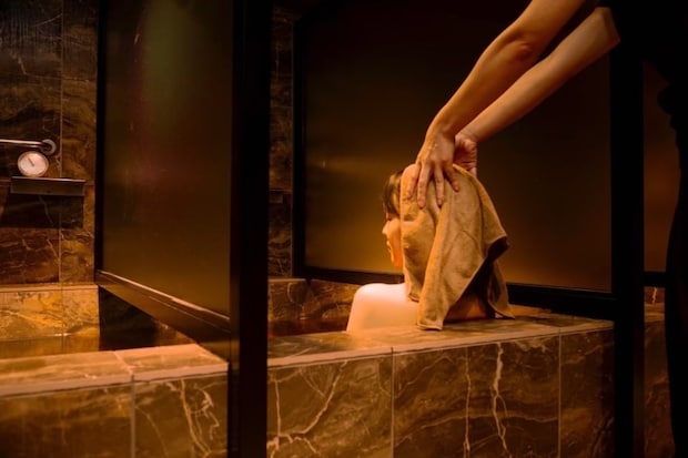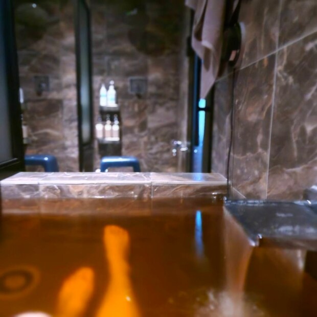 はじめての感覚にキャッキャしながら、背中や二の腕、腰などを当てていきます。お風呂そのものは女性が座ると胸が隠れる程度の深さなので、首の後ろを鍛えたければ潜り気味の姿勢になる必要があります。太ももを鍛えたければひざ立ちになって腰から上はお湯から出た状態になりますが、なにせお湯に漢方入ってるから、暑いのよ! 汗がすごいのよさっきから! 代謝が急によくなったのかしら私! と、心の中でワーキャー言いながら(他の方もご入浴中ですからね……)いろんなポーズを試みます。