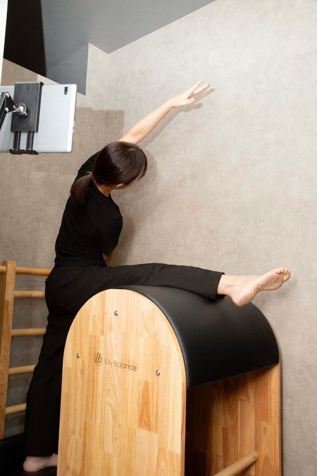 これこれ、マシンピラティスのラダーバレル。ピラティスっていうか、ストレッチですよね。あったかくなってほぐれたからだを伸ばすんです。筋肉痛の緩和になりそう。