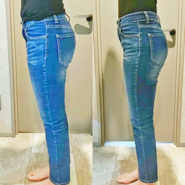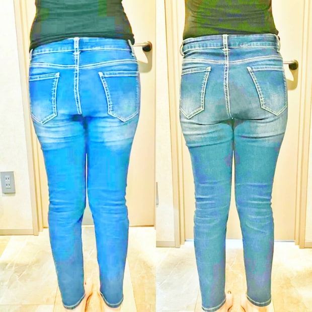 スタッフBさん。左は4月19日で、右は6月11日。2月から入浴をはじめていましたが、スルスル痩せてきたので「面白いぞ」と途中から同じデニムで撮影していたそうです。身が小さくなってきてる!