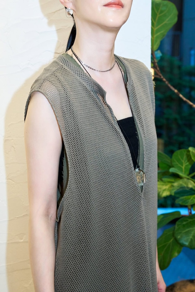 「単調になりがちなドレスのスタイリングに、レイヤードで変化をつけました。2024AWのトレンドカラーであるオリーブグリーンをいち早く取り入れたくて選びましたが、まだまだ気温も高いので、上に重ねたタンクトップはメッシュ素材を選び、アクセサリーもガラス素材で清涼感をプラスしました。バンドゥやサンダルは、オリーブグリーンと好相性のブラックで統一」