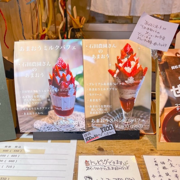 あまおうスペシャルパフェ 1,980円→期間限定1,870円・あまおうミルクパフェ 1,320円