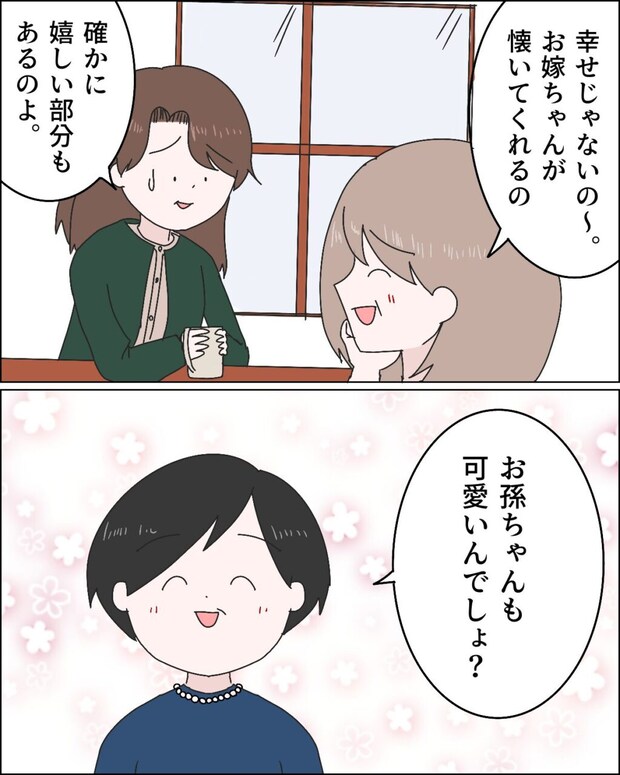 「幸せじゃないの~。お嫁ちゃんが懐いてくれるの。」と言うので、「確かに嬉しい部分もあるのよ」と、私だって嫌がっているわけではないことを言うと、「お孫ちゃんも可愛いんでしょ?」と聞かれ