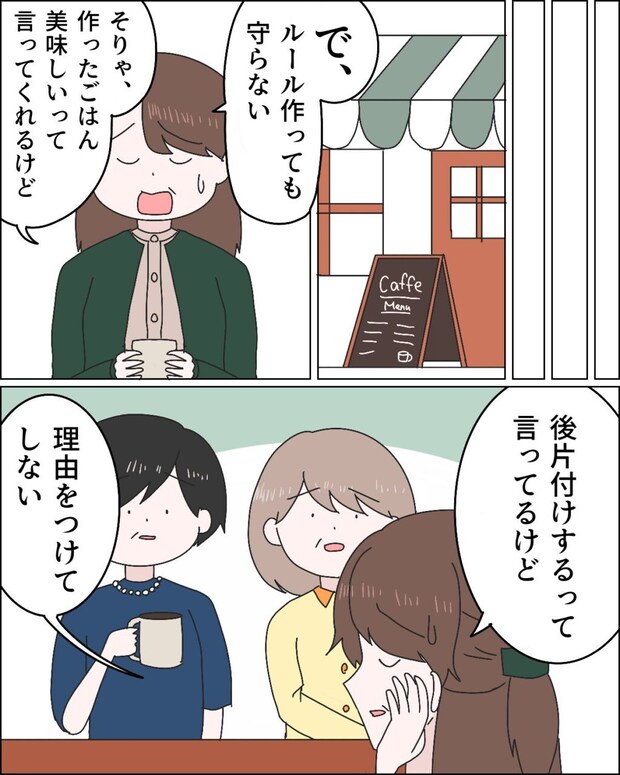 お友達に会うと、ついつい最近の出来事を愚痴ってしまいました。「ルール作っても守らない。そりゃ、作ったご飯美味しいって言ってくれるけど。」「後片付けするって言ってるけど、理由をつけてしない。」などなど。
