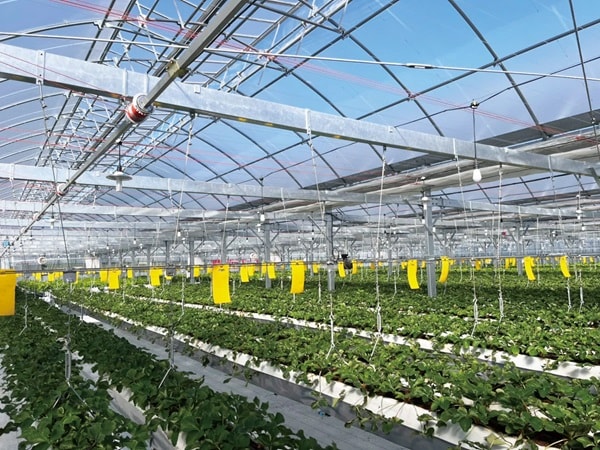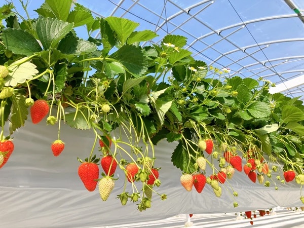 スマート農業を駆使した開放感のある広々したビニールハウスの中には、ハウスの天井から吊るしたいちごが栽培されている。