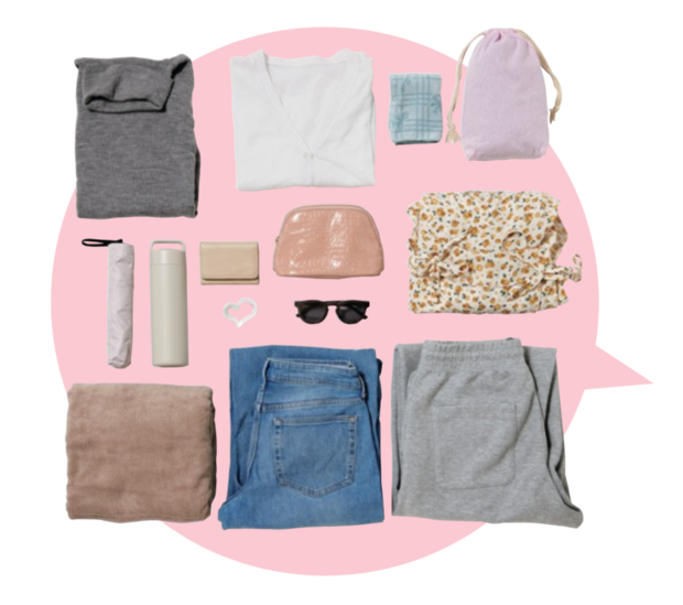 大判タオル、トップス2枚、パンツ2枚、水筒、ポーチなどもまるっと入る。1〜2泊旅行にも使える。